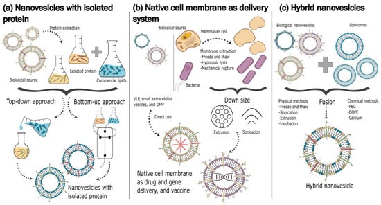 Overview of different strategies to develop biomimetic drug delivery nanosystems. (a) Nanovesicles with isolated proteins produced by top-down or bottom-up approaches; (b) biological nanovesicles, such as small extracellular vesicles and outer membrane vesicles, directly used as drug delivery systems; and (c) hybrid nanovesicles obtained from the fusion of biological vesicles and synthetic liposomes. Reproduced from [] under the Creative Commons Attribution (CC BY) license (https://creativecommons.org/licenses/by/4.0/ (accessed on 28 April 2025)).