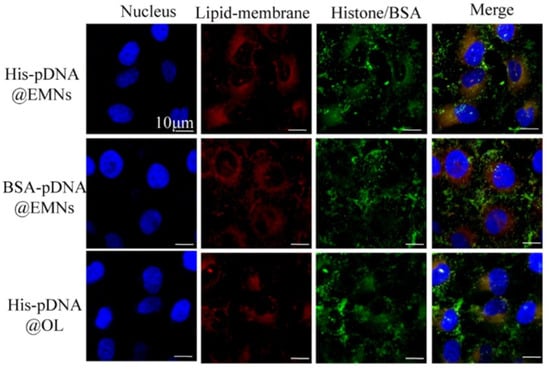 Co-localization analysis of Pigment Epithelium-Derived Factor with histone or bovine serum albumin in HUVEC for His-pDNA@EMNs, BSA-pDNA@EMNs, and His-pDNA@OL (His-pDNA@ordinary liposomes; red: Cy5.5-labeled PEDF-pDNA; green: FITC-labeled Histone or BSA; blue: nucleus). Reproduced with permission from [].