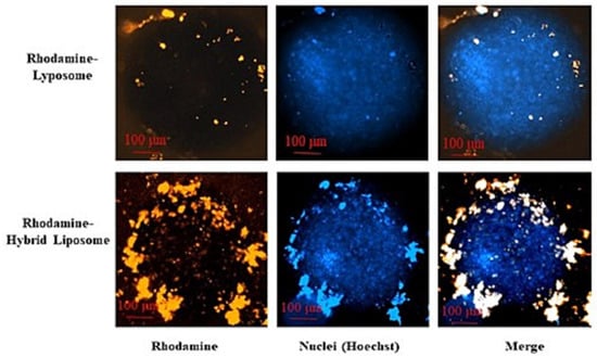 Cell uptake of fluorescent hybrid liposomes in 3D melanoma model. The upper panel shows the fluorescence intensities of rhodamine labelled-liposomes (orange), Hoechst (blue, nuclei), and the merge of them; the bottom panel shows the fluorescence intensities of rhodamine labelled-hybrid liposomes (orange), Hoechst (blue, nuclei), and merge of them. Scale bar 100 μm. Reproduced from [] under the Creative Commons Attribution (CC BY) license (https://creativecommons.org/licenses/by/4.0/ (accessed on 28 April 2025)).