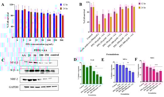 PPPG significantly alleviated acetic acid-induced injury in NCM460 cells. (A,B) Treatment with PPPG significantly restored cell viability reduced by acetic acid (AA) exposure. Cell viability was measured using MTT assay, and results are expressed as mean ± SD (n = 5). (C–F) Western blot analysis revealed that PPPG significantly inhibited the expression of phosphorylated NF-κB and IκB-α while upregulating the expression of Nrf2 and downregulating Keap-1. Densitometric quantification of protein bands was normalized to β-actin and analyzed via ImageJ software. Statistical analysis confirmed significant differences across treatment groups (** p < 0.05 to *** p < 0.001).
