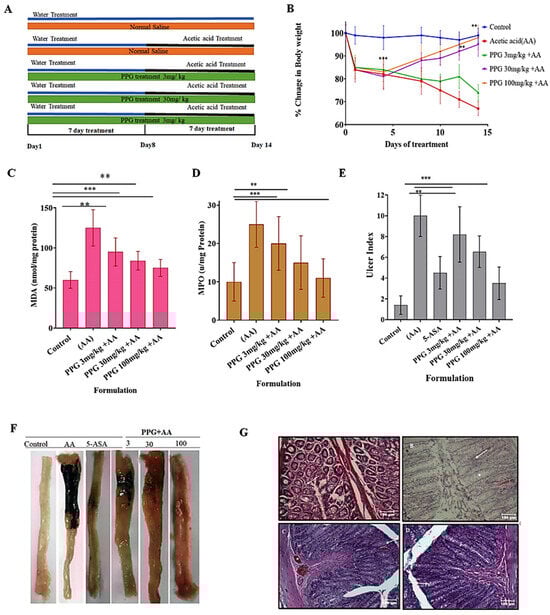 PPG alleviated AA-induced colitis symptoms in rat (A). Experimental design. (B). Changes in body weight. (C). Status of malondialdehyde (MDA) levels in the colons of the control, acetic acid (AA), AA + PPG (3, 30, and 100 mg/kg) ** p < 0.01 and *** p < 0.001, compared with the control group. Data are expressed as means ± SEM. (n = 5). The statistical analysis was carried out by one-way analysis of variance (ANOVA) followed by Tukey’s post hoc test. (D). Effect of PPG extract (3, 30, and 100 mg/kg) on the level of myeloperoxidase (MPO) activity in the colon tissue. Results are expressed as mean ± SEM (n = 5). ** p < 0.01 and *** p < 0.001 compared with control group. The statistical analysis was carried out by one-way analysis of variance (ANOVA) followed by Tukey’s post hoc test. (E). Effect of 5-ASA (2 mg/kg) and PPG extract (3, 30, 100 mg/kg) on ulcer index. Data are expressed as mean ± SEM (n = 5). ** p < 0.01 and *** p < 0.001 compared with control group. The statistical analysis was carried out by one-way analysis of variance (ANOVA) followed by Tukey’s post hoc test (F). Images of colon tissue 14 days after colitis induction. control; acetic acid (AA); 5-ASA and different concentrations of PPG extract test (G). Histopathological images of different groups. Non-colitis (A), colitis control (B), low-dose treatment (C), high-dose treatment (D).