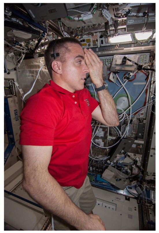 Figure 2. NASA astronaut Chris Cassidy, Expedition 36 flight engineer, performs a visual exam using an eye chart (out of frame) in the Destiny laboratory of the International Space Station. Vision is crucial to the success of the astronaut mission. Image courtesy of NASA.