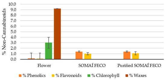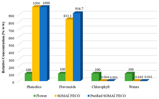 Figure 1, phenolics and flavonoids increase approximately 10-fold and 8-fold, respectively, in SOMAÍ FECO compared to flower, while chlorophyll and waxes are almost entirely removed. In purified SOMAÍ FECO, these ratios remain stable, with flavonoids showing a slight increase (9-fold) relative to flower (see corresponding values in