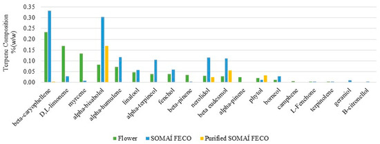 w. As terpenes play a key role in aroma and taste, understanding their changes in composition may help to manage the impact on the sensory profile of the extracts. Thus, their levels were examined across the flower, SOMAÍ FECO extract, and purified SOMAÍ FECO extract to evaluate the influence of extraction and purification when targeting the cannabinoids (