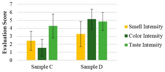 Figure 8), the same sensory attributes were evaluated in samples C, the same purified SOMAÍ FECO identical to sample B, (20 mg/mL major cannabinoids) in MCT oil, and D, a product from the market (25 mg/mL major cannabinoids), but with a panel composed of participants from a higher age range and fewer overall participants. While sample C was rated higher across all attributes, these differences were not statistically significant. However, a notable variation was observed in color perception (