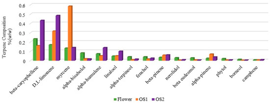 As a proof of concept for this method, the composition of two premium oral solutions was included in addition to this FECO study from its proprietary SOMAÍ Origins and Senses lines, which was manufactured under the strict EU-GMP quality guidelines through the reintroduction of terpenes post-purification. The profile comparison of terpenes of these oral solutions and the flower as the starting material is depicted in