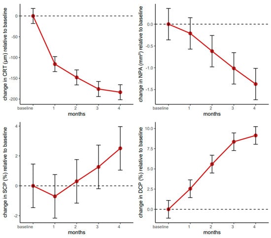 Changes in CRT (upper left), NPA (upper right), SCP (lower left) and DCP (lower right) relative to baseline over four months of faricimab therapy (the black dashed line represents the baseline level, the red solid line indicates changes in the studied parameters, and the black bars represent the 95% confidence intervals at specific time points).