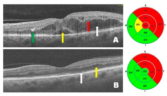 Patient 1—(A) Pre-treatment OCT scan: diffuse (white arrow) and serous (yellow arrow) edema, hard exudates (green arrow) and hyperreflective foci (red arrow) within the macula. (B) Post-treatment OCT scan: significant reduction in intraretinal and subretinal edema and the number of intraretinal cysts, slightly disturbed structure of the retina (yellow arrow), minor RPE and photoreceptor defects (white arrow).