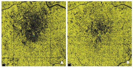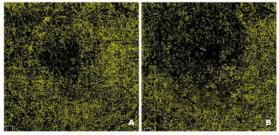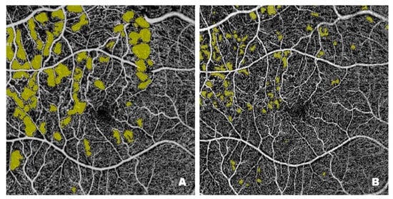 Patient 1—(A) Pre-treatment ORFA (18.529 mm2): any flow in this area (yellow) is a projection artifact or a pathology. (B) Post-treatment ORFA (16.959 mm2): enlargement of dark avascular zones, indicating the restoration of the layered structure of the retina; reduction of flow areas (yellow).