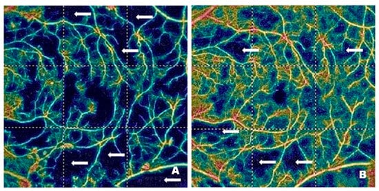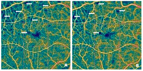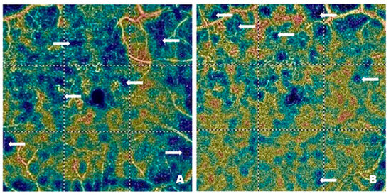 Patient 1—(A) Pre-treatment DCP (42.5%): areas of low capillary perfusion or vascular dropout, clearly visible as blue areas devoid of capillaries. (B) Post-treatment DCP (50.6%): significantly improved vascularization, increased capillary flow, significant reduction of blue areas (arrows).