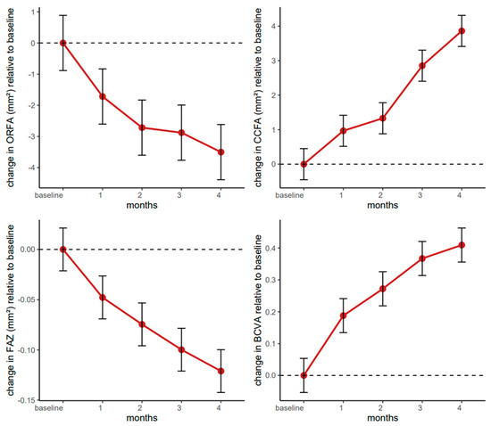Changes in ORFA (upper left), CCFA (upper right), FAZ (lower left) and BCVA (lower right) relative to baseline over four months of faricimab therapy (the black dashed line represents the baseline level, the red solid line indicates changes in the studied parameters, and the black bars represent the 95% confidence intervals at specific time points).