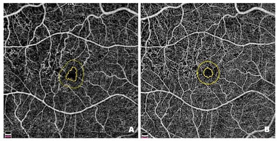 Patient 1—(A) Pre-treatment FAZ (0.165 mm2): disruption of the perifoveal capillary arcades, irregular outline and circularity loss. (B) Post-treatment FAZ (0.116 mm2): reduction in the number of disrupted perifoveal capillary arcade networks, reperfusion of perifoveal capillaries and restoration of FAZ circularity.