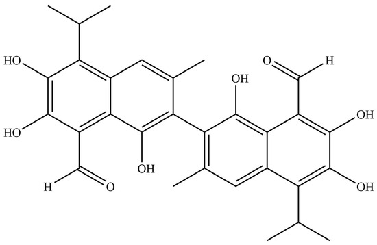 Gossypol (C30H30O8) is a polyphenolic compound derived from cotton seeds, and it is chemically described as 2,2′-bis(8-formyl-1,6,7-trihydroxy-5-isopropyl-3-methylnaphthalene) (Figure 1). Initially developed as a male contraceptive, this dimeric sesquiterpene is now being explored as a potential anticancer agent. Recent research has focused on understanding its mechanisms for fighting tumors and its possible applications in clinical settings [7]. Preclinical studies have shown that Gossypol has various biological effects, such as anti-tumor properties, antioxidants, antiviral activity, broad-spectrum antimicrobial effects, and immune system modulation through the regulation of important signaling pathways [8]. Despite the known effectiveness of Gossypol in treating cervical cancer in experimental models, the specific molecular targets are not yet fully identified. Further research is needed to comprehensively characterize its mechanisms of action through integrated pharmacogenomic strategies and functional validation studies [9,10].