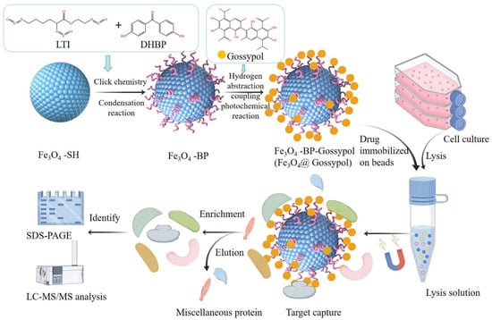 Drug targets are crucial focal points in pharmacological interventions, representing primary sites for drug-receptor interaction and forming the essential biological foundation for therapeutic effectiveness. Identifying targets not only aids in understanding the molecular mechanisms of drug actions but also allows for the predictive evaluation of off-target effects. This process is vital for optimizing the safety profiles of pharmacotherapies and improving the clinical translation in modern drug development pipelines [11]. Molecular “target fishing” technology, a widely accepted method in pharmacoproteomics, operates based on specific interactions between ligands and proteins. This approach involves the covalent attachment of drug molecules to functionalized solid-phase microbeads through controlled chemical modification. The resulting drug-conjugated matrix facilitates the selective capture and enrichment of target proteins through bioorthogonal binding. Subsequently, the proteins are isolated, purified, and structurally characterized using tandem mass spectrometry in conjunction with high-throughput proteomic profiling [12]. Based on this technology, researchers have successfully investigated the therapeutic targets of multiple natural bioactive components, which has significantly contributed to elucidating the pharmacological mechanisms of traditional Chinese medicine (TCM), accelerated the modernization process of TCM, and provided direct or indirect evidence for the identification and validation of natural product targets [13,14,15,16,17,18]. This research employed Fe3O4-SH nanoparticles to facilitate stepwise condensation polymerization between 2-isocyanatoethyl 2,6-diisocyanatohexanoate (LTI) and 4,4′-dihydroxybenzophenone (DHBP), yielding magnetically responsive microspheres grafted with light-sensitive benzophenone moieties. Following this synthesis, Gossypol was conjugated onto the magnetic microspheres’ surface, which were then incubated with lysed HeLa cells to selectively bind and isolate target proteins. The identified proteins were analyzed using high-resolution mass spectrometry (HRMS), and key therapeutic targets were screened and validated, followed by biological functional analysis (Figure 2). This study aims to elucidate the molecular mechanisms responsible for Gossypol’s anti-cervical cancer activity, with the goal of offering new pharmacological insights into its therapeutic effects. The results are anticipated to lay a scientific groundwork for the development of next-generation anti-cervical cancer agents characterized by precisely defined molecular targets and clearly elucidated mechanisms of action.