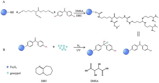 The photochemical reaction was performed in a round-bottomed photoreactor, using -SH group on the surface of Fe3O4-SH (Figure 3). The reactor was filled with 20 mL of Gossypol methanol solution (0.25 mg·mL−1) and 5 mg of Fe3O4-BP particles. The mixture was purged with N2 for 30 min to establish an inert atmosphere, followed by UV irradiation (375 W mercury lamp; light intensity: 12.5 W·m−2; λ = 254 nm) for 1 h. This procedure yielded magnetic particles with surface-conjugated Gossypol, designated as Fe3O4-BP-Gossypol (Fe3O4@Gossypol), which were subsequently collected for further use [13,24].