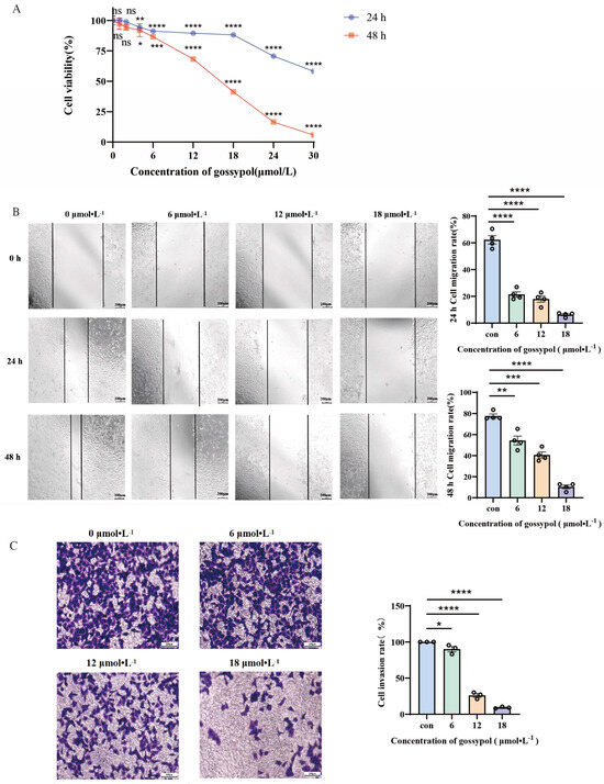 In total, 200 microliters of serum-free DMEM cell suspension was inoculated into the upper chamber of the Transwell system, while 500 microliters of different concentrations (6, 12, and 18 μmol·L−1) of Gossypol was added to the lower chamber. The plates were incubated in a humid environment containing 5% carbon dioxide at 37 °C for 48 h. Subsequently, cells were fixed with 4% paraformaldehyde for 30 min and stained with 0.1% crystal violet solution for 30 min. Cells that migrated to the lower side of the membrane were visualized using an inverted microscope. The invasion rate was quantified by counting the number of cells penetrating the pores/basement membrane and expressed as a percentage relative to the control group [23].