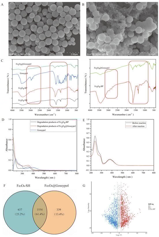 (A) SEM image of Fe3O4–SH. (B) SEM image of Fe3O4@Gossypol. (C) Comparative FT–IR spectra before and after Gossypol conjugation (The red boxes indicate the differences in the infrared spectra of different substances). (D) UV–Vis spectra comparison of Fe3O4−BP and Fe3O4@Gossypol following alkaline hydrolysis. (E) UV absorption spectra comparison of supernatants pre− and post−Gossypol conjugation. (F) Protein overlap diagram between Fe3O4−SH and Fe3O4@Gossypol. (G) Volcano plot. Symbols: − denotes significant downregulation, + denotes significant upregulation, and No diff indicates no significant difference.