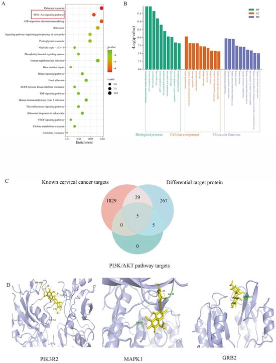 (A) KEGG pathway analysis. (B) Gene Ontology (GO) analysis. (C) Venn diagram illustrating the intersection of Fe3O4@Gossypol hook differential proteins, Gossypol−associated targets, and PI3K/AKT pathway components. (D) Molecular docking models of Gossypol with PIK3R2, GRB2, and MAPK1 proteins.