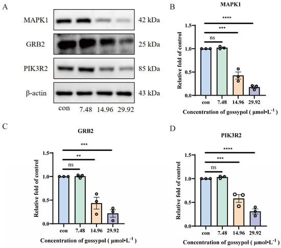 (A) Protein band pattern. (B) Effects of Gossypol on MAPK1 protein expression. (C) Effects of Gossypol on GRB2 protein expression. (D) Effects of Gossypol on PIK3R2 protein expression. Statistical significance is ns indicates no significant difference. ** p < 0.01, *** p < 0.001, and **** p < 0.0001 vs. Con, n = 3.