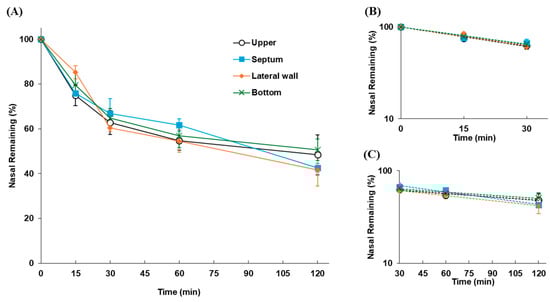 The nasal residual profiles of FD-70 following application as the solution to rats at different locations in the nasal cavity are shown in Figure 2. The clearance profile of FD-70 was consistent regardless of whether it was applied to the upper, nasal septum, lateral wall, or bottom positions in the nasal cavity. The kmc values of FD-70 were 0.0162, 0.0144, 0.0155, and 0.0146 min−1 for the upper, septum, lateral wall, and bottom, respectively, and no significant differences between these values were observed (Table 2).