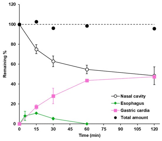 The formulations cleared from the nasal cavity to the pharynx pass through the esophagus to the stomach, and it is assumed that a portion of the formulation is absorbed through the gastrointestinal mucosa, similar to oral administration. However, there are no reports on the kinetic behavior of drug transport from the nasal cavity to the gastrointestinal tract. Therefore, we performed kinetic analysis of the translation of the formulations into the stomach after intranasal administration. Our results demonstrated that the intranasal drug gradually disappeared from the nasal cavity, and the cleared drugs rapidly passed through the esophagus and reached the stomach (Figure 3). The amount of drug remaining in the esophagus was small at all sampling times and was eliminated within 60 min after administration, suggesting that the drug cleared from the nasal cavity did not remain in the esophagus and was rapidly transferred to the stomach. In addition, the total amount of drug remaining in the nasal cavity, esophagus, and stomach was always almost equal to the administered amount, indicating that the drug administered into the nasal cavity was cleared by MC and that all of it reached the stomach via the esophagus. Because it was thought that digestion in the stomach would have a large effect on the quantitative evaluation of drug residence, in this study, instead of directly measuring the intragastric concentration of the marker, an indirect evaluation was adopted in the gastric cardia, which is the part just before the drug enters the stomach; ligation was carried out, and the amount of drug remaining in the cardia was quantified. The obtained results do not require consideration of digestion in the stomach, and the total amount estimated to enter the stomach can be measured. Based on these results, it may be possible to accurately predict the total amount of drug absorbed after intranasal administration by evaluating the amount absorbed through the nasal mucosa and by considering the rate of drug absorption after oral administration. These findings will be beneficial for constructing a prediction model for drug absorption after intranasal administration from in vitro systems.