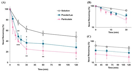 Disappearance profiles of each dosage form in the nasal cavity following intranasal administration. (A) Time profiles of remaining formulations in the nasal cavity. (B) Slope of the linear elimination of the α-phase (up to 30 min) plotted on a semi-logarithmic scale. (C) Slope of the linear elimination of the later phase (30–120 min) plotted on a semi-logarithmic scale. Data are expressed as the means of three–five independent experiments, with vertical bars showing S.E.M. Statistical significance is represented as ***, p < 0.001; **, p < 0.01; and *, p < 0.05, compared with the solution.