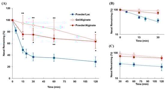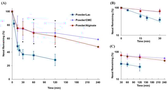 Gel and powder formulations containing sodium alginate (Gel/Alginate and Powder/Alginate) were prepared, and their nasal residences in rats were compared (Figure 6). The retention time of the gel formulation in the nasal cavity was higher than that of the powder formulations. An increase in the residual amount of the formulations in the nasal cavity was observed by applying sodium alginate gel, although the difference was not statistically significant compared to that of the sodium alginate powder. The nasal residence of formulations was improved by the gelation of sodium alginate; the retention time of formulations undergoing MC (t1/2(mc)) was increased 11.8 and 3.56 times compared to the non-adhesive powder (Powder/Lac) and mucoadhesive powder formulation (Powder/Alginate), respectively (Table 5).
