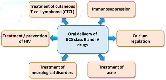Compared with other nanocarriers, SNEDDS can be effortlessly scaled up and have lower manufacturing costs []. They are usually selected for the enhancement of the oral bioavailability of hydrophobic drugs (e.g., cyclosporine A), for which there exist marketed formulations (Figure 1) such as Sandimmune® and Neoral® (Novartis, Basel, Switzerland) []. SNEDDS can be administered in the form of an oil phase (i.e., mixture of excipients) and are anticipated to convert to o/w nanoemulsions on the intestinal mucosa []. Lately, SNEDDS have been assessed for the delivery of hydrophilic biomolecules (e.g., therapeutic peptides) via the oral administration route [,,,]. An in vivo pharmacokinetic study of insulin glargine (IG) administered to rats both intravenously (i.v.) and orally (i) in the form of a solution and (ii) in the form of a IG-HIP (hydrophobic ion pair) complex encapsulated in SNEDDS revealed a maximum insulin concentration equal to 43.5 ± 5.4 mIU L−1 for the i.v. injection in comparison with 26.3 ± 8.1 mIU L−1 for SNEDDS and 4.3 ± 2.1 mIU L−1 for the oral IG solution 120 min after dosing. The orally administered IG-HIP complex in the SNEDDS formulation exhibited a higher bioavailability (e.g., 2.13%) in comparison with the IG solution (e.g., 0.27%) [].