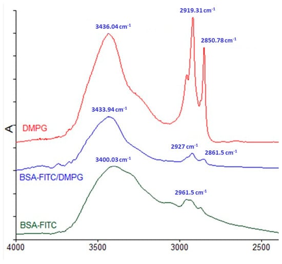 Protein/DMPG complexes were successfully formed by the hydrophobic ion pairing method. FTIR spectroscopy (Frontier FTIR spectrometer, Perkin Elmer) was used to study the interaction of BSA-FITC and OVA with DMPG. Figure 2 shows the infrared spectra of DMPG, BSA-FITC/DMPG complex and BSA-FITC. As can be observed, the frequencies of the CH2 vibrations of DMPG (i.e., symmetric 2850.78 and antisymmetric 2919.31 cm−1 stretching) are shifted towards higher values in the BSA-FITC/DMPG spectrum (i.e., 2861.5 and 2927 cm−1, respectively). This could be attributed to the association of BSA-FITC with DMPG, resulting in lipid structural changes. The aforementioned vibrations are sensitive to lipid acyl chain conformation, whereas they are basically free of contribution from the protein component [,].
