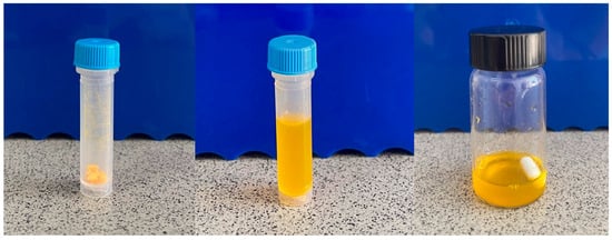 Lyophilized BSA-FITC/DMPG complex formed via hydrophobic ion pairing (left). ST-SNEDDS-BSA-FITC/DMPG, i.e., transparent oily solution consisting of a mixture of Labrafil M 1944 CS, Kolliphor HS15, Squalene and α-Tocopherol, where the BSA-FITC/DMPG complex has been dissolved with the aid of vortex and sonication at a 40% amplitude for 2 min in an ice bath with a microtip sonicator (middle). ST-SNEDDS-BSA-FITC/DMPG oil-in-water (o/w) nanoemulsion spontaneously formed by the dropwise addition of PBS to the oily solution ST-SNEDDS-BSA-FITC/DMPG under magnetic stirring (right).