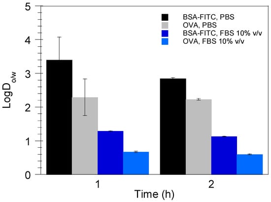 Distribution coefficient LogDo/w of the antigenic proteins BSA-FITC and OVA (solutes) between the nanoemulsion droplets (oil phase, o) and the release media PBS and FBS 10% v/v (aqueous media, w) as determined by suspending the protein/DMPG complexes in PBS and FBS 10% v/v. Results are presented as mean ± SD (n = 3).