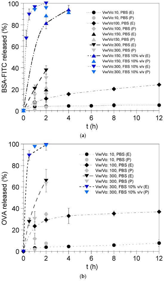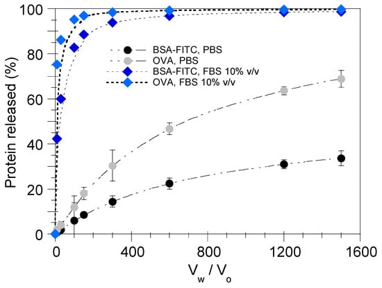 Figure 5 illustrates the effect of Vw/Vo ratio on the percentage of BSA-FITC and OVA released in PBS, FBS 10% v/v. It is apparent that the amount of protein released from the nanoemulsion droplets increases with the increase in Vw/Vo ratio, a phenomenon that is strongly enhanced when the encapsulated protein is OVA and the release medium is FBS 10% v/v. Notably, in the case of FBS 10% v/v, beyond a specific Vw/Vo value (e.g., 300), the protein release reaches a plateau value and no longer increases, indicating an instant protein release from the nanoemulsion droplets for Vw/Vo ≥ 300.