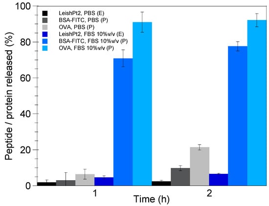 It should be noted that a comparison between the protein (e.g., BSA-FITC, OVA) release results presented in Figure 6 and the previously published data on LeishPt2 (i.e., multi-epitope Leishmania peptide) released from the nanoemulsion droplets [] reveals a slower peptide release in both release media (e.g., PBS, FBS 10% v/v), with the phenomenon being dramatically enhanced in the case of FBS 10% v/v. Taking into account that LeishPt2 release experiments were performed at a Vw/Vo ratio equal to 50, and that the release profile is highly dependent on this ratio, Figure 7 attempts a direct comparison of the predicted amount (%) of BSA-FITC and OVA released from the nanoemulsion droplets after 1 and 2 h in PBS and FBS 10% v/v with the experimentally measured amount of LeishPt2 for a Vw/Vo ratio equal to 50 [].