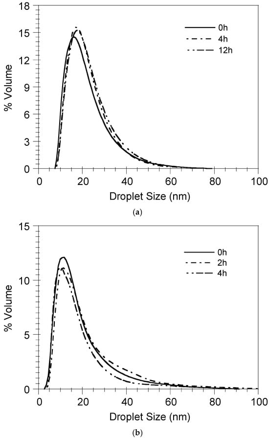 Figure 8 shows the evolution of the droplet size distribution (DSD) of the nanoemulsions formed by the nanoemulsification of the BSA-FITC/DMPG- (Figure 8a) and OVA/DMPG-loaded (Figure 8b) ST-SNEDDS for numerous weeks at 4 °C. As can be observed in this Figure, independent of the protein loading, the nanoemulsions’ DSDs do not change dramatically with respect to time, denoting their stability in these conditions. A probable explanation could be the electrostatic repulsion between the nanodroplets exhibiting negative surface charges.