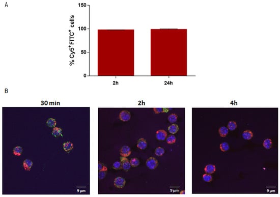 In order to investigate the ability of the Cy5-labeled ST-SNEDDS-BSA-FITC nanoformulation to be efficiently taken up by antigen-presenting cells, a prerequisite for immune response elicitation, J774 macrophage line cells were exposed in a concentration of 260 μg/mL of ST-SNEDDS-BSA-FITC for 2 h and 24 h. Flow cytometry revealed that from 2 h post exposure, 98 ± 0.2% of cells had taken up ST-SNEDDS-BSA-FITC, a percentage that remained stable after 24 h (98 ± 2%) (Figure 10a). The above results, in accordance with previous findings [], indicate that the uptake process was completed during the first hours of exposure. This finding could be attributed to the size of the nanodroplets (<30 nm) [], which enables cellular uptake via pino- or micropinocytosis, as well as their hydrophobic nature [,].