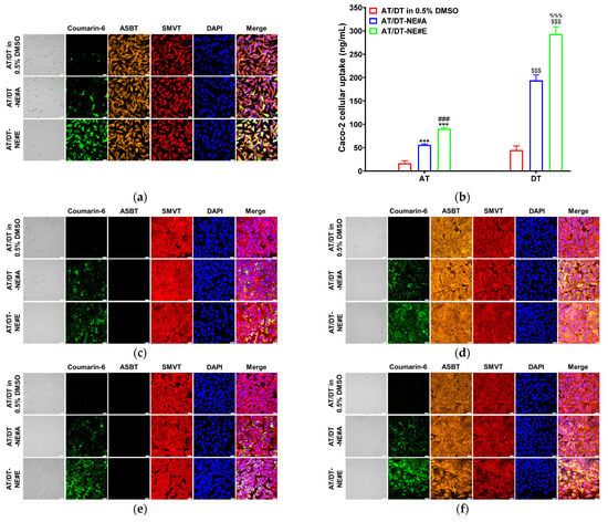 In vitro cellular uptake of AT/DT-NEs. (a) Confocal images of Caco-2 cells treated with coumarin-6-coloaded AT/DT in 0.5% DMSO, AT/DT-NE#A, and AT/DT-NE#E (scale bar: 20 µm). (b) Quantitative analysis of AT and DT uptake in Caco-2 cells after 1 h treatment. Values represent mean ± SD (n = 3). *** p < 0.001 vs. AT from AT/DT in DMSO; ### p < 0.001 vs. AT from AT/DT-NE#A; $$$ p < 0.001 vs. DT from AT/DT in DMSO; %%% p < 0.001 vs. DT from AT/DT-NE#A. (c–f) Confocal images of coumarin-6-coloaded AT/DT uptake in ASBT-non-transfected MDCK cells with SMVT inhibition (c), ASBT-transfected MDCK with SMVT inhibition (d), ASBT-non transfected MDCK without SMVT inhibition (e), and ASBT-transfected MDCK without SMVT inhibition (f) (scale bar: 20 µm). Quantitative uptake of (g) AT and (h) DT in the four MDCK cell groups after 1 h treatment. Values represent mean ± SD (n = 3). ** p < 0.05, *** p < 0.001 vs. AT/DT in DMSO; # p < 0.05, ## p < 0.01, ### p < 0.001 vs. AT/DT-NE#A; $ p < 0.05, $$ p < 0.01 vs. ASBT (–)/SMVT (–); % p < 0.05 vs. ASBT (–)/SMVT (+).