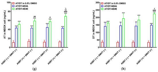 Direct quantification of intracellular AT and DT concentrations in MDCK cells further validated these findings. For AT/DT-NE#E, AT uptake was increased by 14.3% in ASBT-transfected cells with SMVT inhibition and by 11.5% in non-ASBT-transfected cells with active SMVTs, compared to cells lacking both ASBT and SMVT activity (Figure 2g). Similarly, DT uptake was enhanced by 18.1% and 12.1%, respectively, under the same conditions (Figure 2h). Moreover, the concurrent activation of both ASBT and SMVT significantly enhanced the cellular uptake of AT and DT by 17.5% and 16.3%, respectively, compared to cells with ASBT activation alone. Additionally, AT and DT uptake was increased by 20.4% and 22.5%, respectively, relative to cells with only SMVT activation (Figure 2g,h).