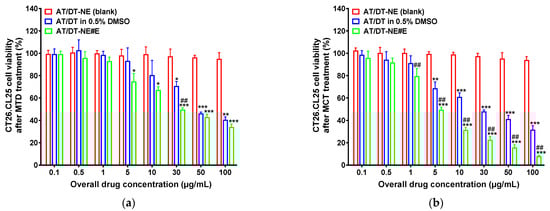 Cell viability assays were conducted to evaluate the cytotoxicity of AT/DT in 0.5% DMSO, AT/DT-NE#E, and the corresponding NE vehicle (AT/DT-NE#E) over a wide concentration range (0–100 µg/mL). As shown in Figure 3, the vehicle control (AT/DT-NE#E) exhibited negligible cytotoxicity under both MTD and MCT regimens, maintaining >95% cell viability at all tested concentrations, indicating excellent biocompatibility. In contrast, both AT/DT in 0.5% DMSO and AT/DT-NE#E showed concentration-dependent cytotoxic effects in CT26.CL25 cells under MTD and MCT conditions (Figure 3a,b). Under the MTD regimen, the IC50 values were 65.1 ± 5.03 µg/mL for AT/DT in 0.5% DMSO and 39.8 ± 2.51 µg/mL for AT/DT-NE#E, indicating a 38.9% improvement in cytotoxic potency with the NE formulation (Figure 3a).