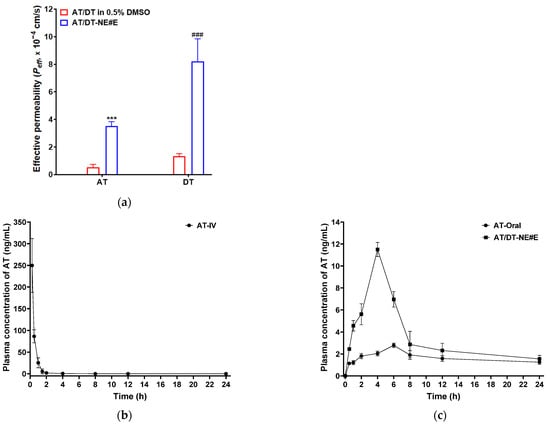 The primary objective of formulating AT/DT-NEs was to improve the membrane permeability and oral bioavailability of AT and DT, which are otherwise limited by their low aqueous solubility and rapid precipitation upon dispersion [,]. As shown in Figure 1d, AT and DT dispersed in 0.5% DMSO exhibited poor membrane permeability. In contrast, incorporation into NE#A significantly enhanced the permeability of AT and DT by 126% and 214%, respectively, compared to their free forms. Further improvements were observed with the addition of functional excipients. Specifically, compared to NE#A, the permeability of AT was enhanced by 23.5% in NE#B (with TPGS), 67.3% in NE#C (with D-TAP), and 50.0% in NE#D (with Biotin-PE). For DT, the respective increases in permeability were 81.8%, 105%, and 86.5% (Figure 1d). These improvements suggest that the incorporated excipients contributed to enhanced passive diffusion, likely through increased lipophilicity, improved drug solubilization, and modulation of interfacial tension within the NE droplets.