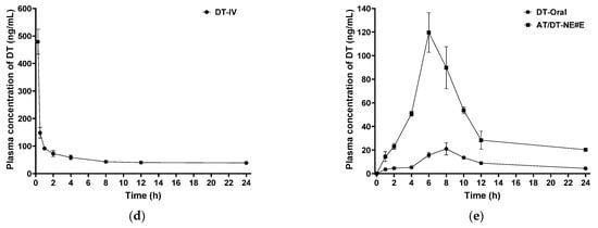 To evaluate the plasma concentration profiles of AT and DT following oral administration of the optimized NE formulation (AT/DT-NE#E), a pharmacokinetic study was conducted on rats. The formulation was administered orally at doses of 2.5 mg/kg for AT and 10 mg/kg for DT. For comparison, control groups received either IV bolus injections of AT (2.5 mg/kg) and DT (5 mg/kg) or oral suspensions of each drug dispersed in 0.5% DMSO at equivalent doses of formulations. Blood samples were collected from the cannulated femoral vein at predetermined time points and immediately centrifuged at 13,000× g for 5 min to obtain plasma. The supernatant was harvested and stored at −80 °C until analysis.