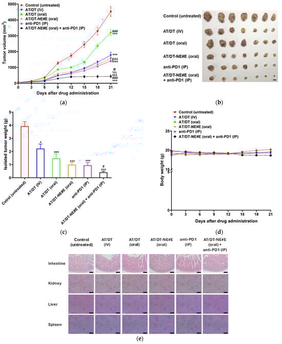 The in vivo antitumor efficacy of the orally administered NE formulation containing AT and DT was evaluated using a syngeneic colon cancer model. BALB/c mice were chosen due to their immunocompetent status and compatibility with CT26.CL25 cells, enabling reliable evaluation of both tumor suppression and immune modulation. CT26.CL25 cells (1 × 106 cells in 100 µL PBS, pH 7.4) were subcutaneously inoculated into the right dorsal flanks of 7-week-old female BALB/c mice. CT26.CL25 is a murine colon carcinoma line that exhibits characteristics similar to human microsatellite-stable (MSS) colorectal cancer, including immune resistance and a suppressive tumor microenvironment, making it suitable for immunotherapy studies. Once the tumor volume reached approximately 50–60 mm3, the animals were randomly assigned to six treatment groups (n = 7 per group): untreated control, AT/DT administered IV (AT 2.5 mg/kg + DT 10 mg/kg, single IV injection), AT/DT administered orally (AT 2.5 mg/kg + DT 10 mg/kg, once daily), anti-programmed cell death protein 1 (anti-PD1) treatment (10 mg/kg, intraperitoneal [IP] injection every 3 days), AT/DT-NE#E administered orally (AT 2.5 mg/kg + DT 10 mg/kg, once daily), and combined treatment of AT/DT-NE#E (oral) with anti-PD1 (IP).