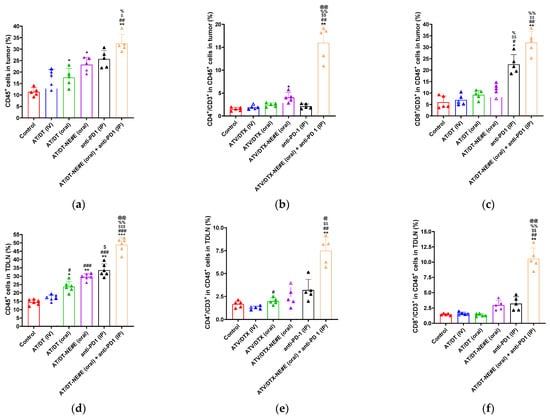 To investigate further the in vivo immunostimulatory effects of orally administered metronomic AT/DT, female BALB/c mice were subcutaneously inoculated with 1 × 106 CT26.CL25 cells per mouse. Once the tumor volume reached approximately 60–70 mm3, the mice were randomly assigned to six treatment groups (n = 5 per group): untreated control, AT/DT administered IV, AT/DT administered orally, AT/DT-NE#E administered orally, anti-PD1 administered IP, and combination treatment with AT/DT-NE#E (oral) and anti-PD1 (IP). The treatment was continued for 21 consecutive days at equivalent doses as described in Section 2.10. Following the treatment period, the mice were euthanized, and tumor tissues along with tumor-draining lymph nodes (TDLNs) were harvested for analysis of immunomodulatory responses.