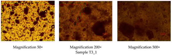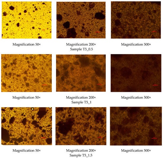 Optical light microscopy images of the rutin-loaded polyethylene oxide (PEO) printing gels. Magnification 50×, 200×, and 500×. Red scale is equal to 100 µm.