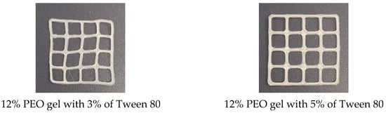 In the preliminary tests, we printed rutin-loaded 12% aqueous PEO gels without any additional excipients. Rutin is poorly soluble in water [6], so when its ethanolic solution was added to the aqueous PEO gel (without surfactants), the crystallisation/sedimentation of rutin occurred immediately. The crystals of rutin were clearly visible on the walls of the vessel. In such cases, it would be impossible to ensure the uniform dosing of the active ingredient, and it is, therefore, not necessary to confirm this phenomenon microscopically. Thus, the results were not satisfactory, since the homogeneity of the gels was quite poor, and rutin was partially oxidised during the 3D-printing process, which was manifested in brownish-coloured areas in the 3D-printed scaffolds. Since rutin is an antioxidant and phenolic compound, it readily undergoes redox reactions [6]. Therefore, we did not continue in this research line, concluding that this approach does not ensure a good printing quality for the final preparations.