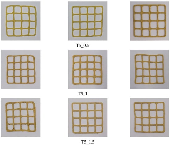 The PEO gels loaded with rutin at all three concentrations and prepared as described in the previous paragraph showed good printability in the SSE 3D-printing process (Figure 2, Table 3). We used three different rutin concentrations in the printing gels (0.5, 1.0, and 1.5 g in 10 mL of the gel). In the 3D-printed round scaffolds, the rutin dose was 17 mg, 50 mg, or 67 mg based on the concentration of rutin in the printing gel. Using PEO gels with a rutin concentration of 100 mg/mL (T5_1) led to the highest quality of printed scaffolds based on visual inspection and surface area analysis [27,30]. With the present printing gel, it is possible to print rutin-loaded preparations of any size, shape, and dose. By increasing the number of printed layers in these preparations, the dose of rutin can be increased accordingly.