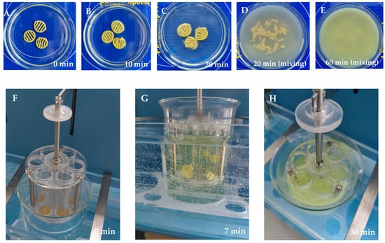Disintegration of the semisolid extrusion (SSE) rutin-loaded 3D-printed polyethylene oxide (PEO) scaffolds in purified water at room temperature at 22 ± 2 °C (pilot test): (A) 0 min; (B) 10 min; (C) 20 min (without mixing); (D) 20 min (with gentle mixing); and (E) 60 min (with gentle mixing) (n = 3). Disintegration test according to the European Pharmacopoeia in purified water at 37 ± 0.5 °C: (F) 0 min; (G) 7 min; and (H) 30 min (n = 6).