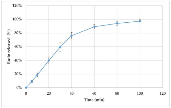 Figure 4 shows the release behaviour of rutin from the 3D-printed discs (T5_1) in vitro. According to the European Pharmacopoeia monograph 2.9.3. “Dissolution test for solid dosage forms” [35], the established time period for performing the dissolution test in vitro is 60 min. In our study, however, the preliminary results showed that 81–89% of rutin was released from the 3D-printed scaffolds within 60 min. Therefore, we continued the dissolution test up to 100 min. As seen in Figure 4, approximately 88–103% of rutin was released within 80 min, and virtually all of the active agent load was released within 100 min.