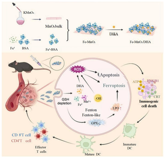 Iron-based systems further exemplify the versatility of metals in ICD induction. Huang et al.’s Fe-MnO2 nanosheets functionalized with dihydroartemisinin (DHA) demonstrated iron’s ferroptosis–ICD coordination. Fe2+/Mn2+-driven Fenton reactions and DHA-derived ROS cooperatively depleted glutathione and inactivated GPX4, triggering ferroptosis []. Concurrently, lipid peroxidation and apoptosis synergized to enhance ICD, promoting DC activation and T cell infiltration. The study illustrated how iron’s redox activity can amplify oxidative damage while linking ferroptosis to immune recognition—a critical advantage over traditional ferroptosis inducers lacking immunogenicity (Figure 4).