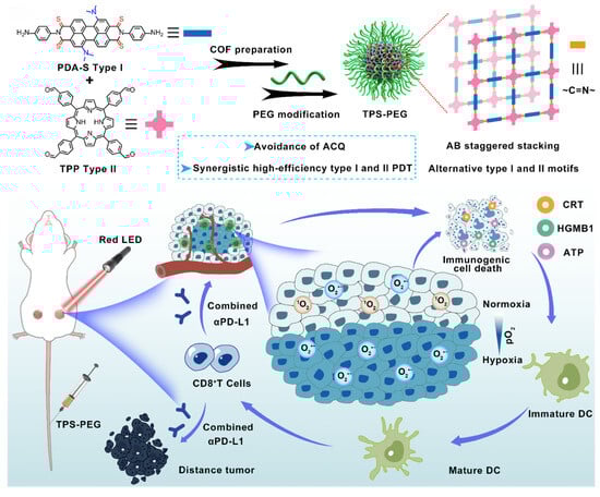 Zhang et al., for instance, introduced a copper-embedded 3D covalent organic framework (Cu@COF-TATB) that synergistically combined photodynamic ROS generation with Fenton-like reactions []. This approach yielded oxidative species with dual roles, enhancing immunogenic cell death and antitumor immunity. Furthermore, when combined with aPD-1, this approach elicited systemic immune responses that inhibited abscopal tumor growth, with tumor slides exhibiting the highest levels of CD3+ and CD8+ T cells when this approach was used. Zhou et al. subsequently showed that staggered COF designs could spatially segregate Type I and II photosensitizers, facilitating concurrent O2•− and 1O2 production even in a hypoxic TME. This potent ROS generation triggered efficient apoptosis/ICD and, when combined with ICIs, reversed tumor immunosuppression to ablate hypoxic tumors and suppress metastases through photodynamic immunotherapy [] (Figure 5).