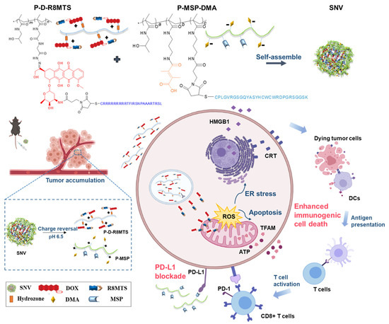 Schematic of DOX-loaded self-assembled nano vehicle (SNV) integrating mitochondrial ICD induction and PD-L1 blockade for amplified cancer immunotherapy. Adapted with permission from []. Copyright © 2022, Chinese Pharmaceutical Association and Institute of Materia Medica, Chinese Academy of Medical Sciences.